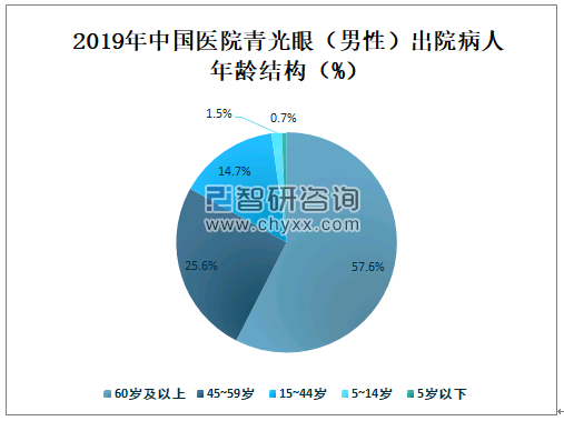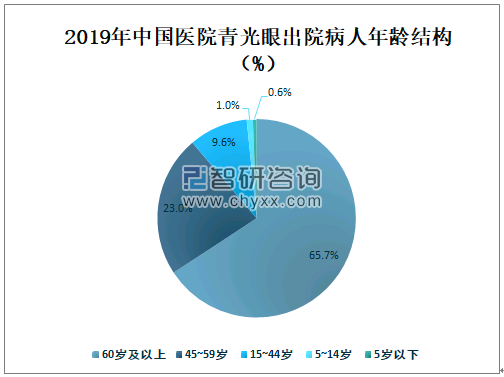 2019年中国60岁及以上青光眼病人占全国青光眼总出院病人的65.7%,占比最大;45~59岁青光眼病人占全国青光眼总出院病人的23.0%;15~44岁青光眼病人占全国青光眼总出院病人的9.6%;5~14岁青光眼病人占全国青光眼总出院病人的1.0%;5岁以下青光眼病人占全国青光眼总出院病人的0.6%。
