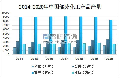 据国家统计局数据显示,2020年中国乙烯产量为2160万吨,同比增长5.2%;烧碱产量为3643万吨,同比增长5.2%;硫酸产量为8332万吨,同比下降6.8%;纯碱产量为2533.4万吨,同比下降12.3%。
