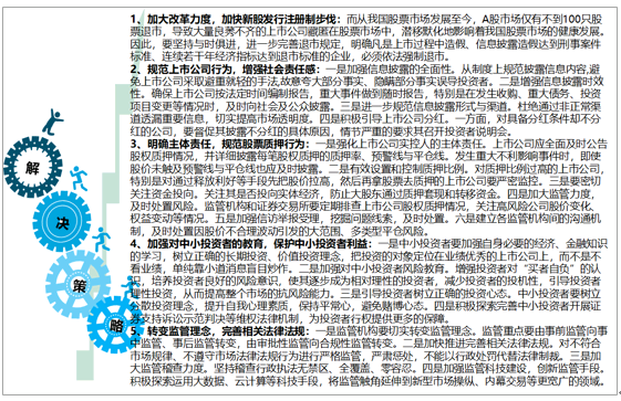面对中国股票市场发展中存在问题,解决策略主要有:加大改革力度,加快新股发行注册制步伐;规范上市公司行为,增强社会责任感;明确主体责任,规范股票质押行为;加强对中小投资者的教育,保护中小投资者利益;转变监管理念,完善相关法律法规等。