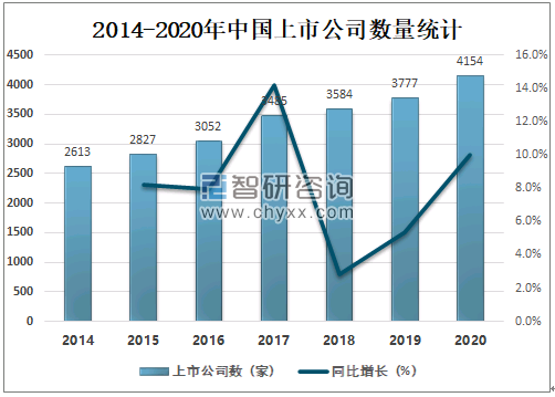 中国股票市场经过二十多年的发展,在筹集企业发展所需资金、改善企业融资结构、优化社会资源配置、促进中国经济发展等方面起到了十分重要的作用。近年来中国上市公司数量逐年增加,2020年中国共有上市公司4154家,较2019年增加了377家,同比增长10.0%。