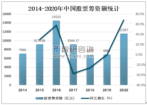 智研咨询发布的《2021-2027年中国股票产业发展态势及投资决策建议报告》数据显示:2017年中国股票筹资额开始下滑,2019年较2018年小幅回升,2020年较2019年大幅增长,2020年中国股票筹资额达11567亿元,较2019年增加了4704亿元,同比增长68.5%。