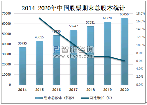 2020年中国股票期末总股本达65456亿股,较2019年增加了3736亿股,同比增长6.1%。