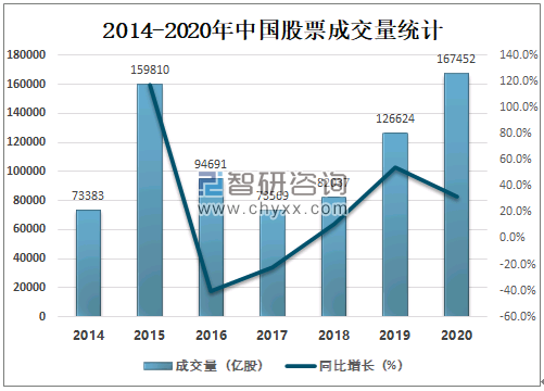 自2018年开始中国股票成交量逐年攀升,2020年中国股票成交量达167452亿股,较2019年增加了40827.57亿股,同比增长32.2%。