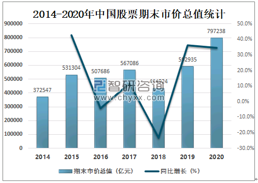 截止2020年12月中国股票期末市价总值达797238亿元,较2019年同期增加了204303亿元,同比增长34.5%。