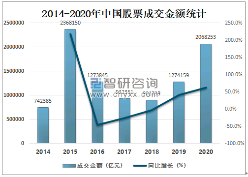 随着中国股票成交量的增加,成交金额也随之增长,2020年中国股票成交金额达2068253亿元,较2019年增加了794094亿元,同比增长62.3%。