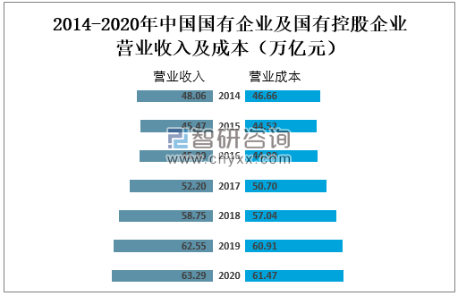 2014-2020年中国国有企业及国有控股企业营业收入及成本(万亿元)