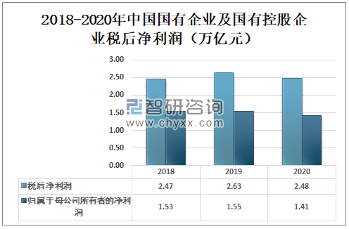 2020年中国国有企业及国有控股企业税后净利润为2.63万亿元,归属于母公司所有者的净利润1.55万亿元;2020年中国国有企业及国有控股企业税后净利润为2.48万亿元,归属于母公司所有者的净利润1.41万亿元。