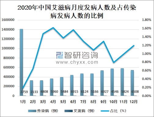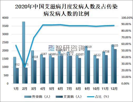 2020年中国艾滋病月度发病人数及占传染病发病人数的比例