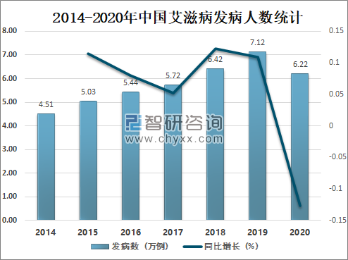 艾滋病属于感染科危害性较大的传染性疾病,其因艾滋病病毒感染所导致,HIV病毒入侵后易破坏机体免疫系统,损伤CD4T淋巴细胞,促使人体免疫功能丧失,进而致使人体被各种疾病感染,导致其死亡,严重危害了人们的健康与生命安全。近年来中国艾滋病发病人数呈增长趋势,但2020年较2019年有所下降,2020年中国艾滋病发病人数为6.22万例,较2019年减少了0.90万例,同比减少12.7%。