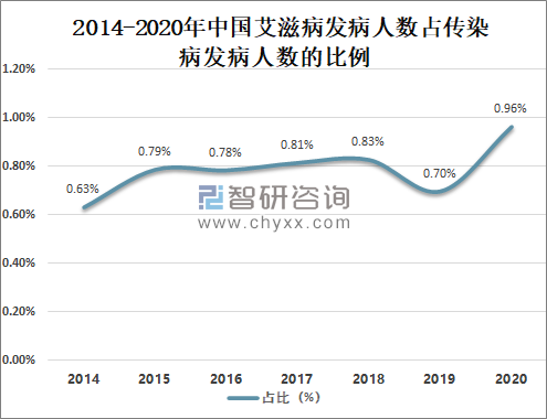 中国艾滋病发病人数占传染病发病人数的比例呈增长趋势,2020年中国艾滋病发病人数占传染病发病人数的0.96%,较2019年增长了0.27%。
