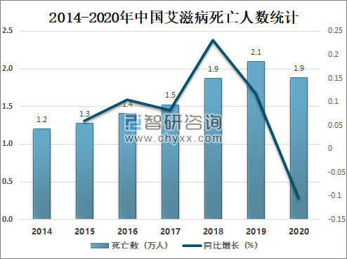 近年来中国艾滋病死亡人数逐年增加,但2020年较2019年有所下滑,2020年中国艾滋病死亡人数为1.9万人,较2019年减少了0.2万人,同比减少10.4%。