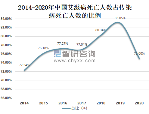 中国艾滋病死亡人数长期占传染病死亡人数的七成以上,2020年中国艾滋病死亡人数占传染病死亡人数的75%,较2019年减少了8.05%。