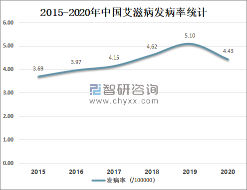 自2016年起中国艾滋病发病率逐年攀升,2019年中国艾滋病发病率达5.10/10万,较2018年增加了0.48/10万,2020年较2019年明显减少,2020年中国艾滋病发病率为4.43/10万,较2019年减少了0.67/10万。
