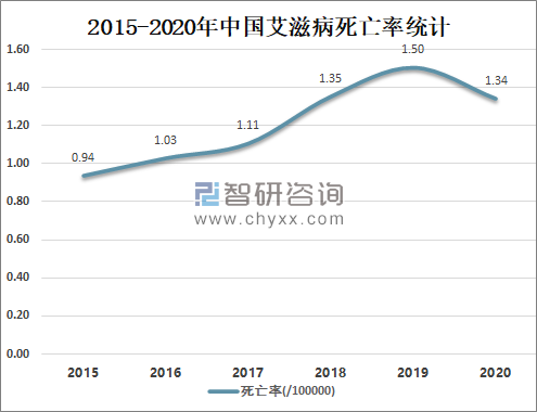 2019年年中国艾滋病死亡率达1.50/10万,较2018年增加了0.15/10万,2020年较2019年明显减少,2020年中国艾滋病死亡率为1.34/10万,较2019年减少了0.16/10万。