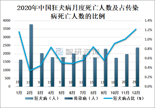 2020年中国狂犬病月度死亡人数及占传染病死亡人数的比例