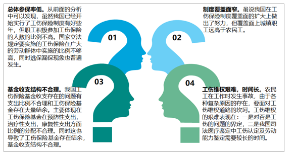 目前中国工伤保险制度存在的问题主要有总体参保率低、制度覆盖面窄、基金收支结构不合理、工伤维权艰难,时间长等。