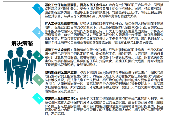 面对中国工伤保险制度存在的问题,解决策略主要有:强化工伤保险的重要性,提高农民工参保率;扩大工伤保险覆盖范围;调整工伤认定范围;政府加强安全生产监督;规范用人单位用工行为等。