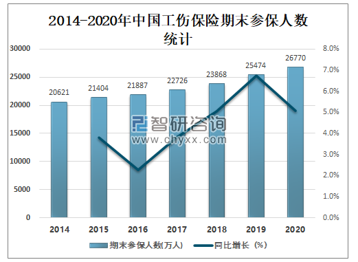 我国经济飞速发展,从农业生产中加入工业生产中的劳动力数量不断增加,在工业操作中工伤事故和职业病发生频数也在随之增涨。作为国家安全生产的保护网,工伤保险制度发挥着非常重要的作用。近年来中国工伤保险期末参保人数逐年增加,截止2020年年末中国工伤保险参保人数达26770万人,较2019年增加了1295.6万人,同比增长5.1%,未来将保持增长。