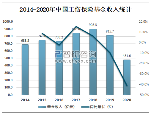 2020年受新冠肺炎疫情影响中国工伤保险基金收入明显减少,2020年中国工伤保险基金收入为481.6亿元,较2019年减少了334.07亿元,同比减少41.0%。