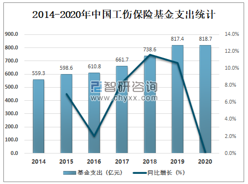 智研咨询发布的《2021-2027年中国保险行业市场全景调查及发展规模预测报告》数据显示:中国工伤保险基金支出呈增长趋势,2020年中国工伤保险基金支出达818.7亿元,较2019年增加了1.32亿元,同比增长0.2%。