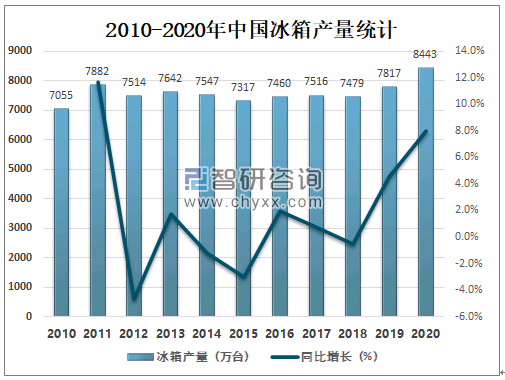 自上世纪50年代我国开始生产冰箱以来,经过几十年的发展变迁,冰箱现如今已经走入千家万户,成为家中生活必备品之一。2020年中国冰箱产量达8443万台,较2019年增加了626万台,同比增长8.0%。