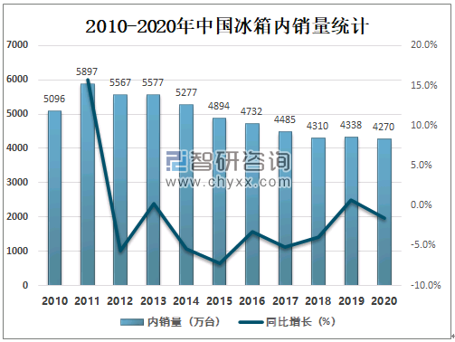 智研咨询发布的《2021-2027年中国冰箱行业供需态势分析及竞争格局预测报告》数据显示:总体来看中国冰箱内销量呈下滑趋势,2020年中国冰箱内销量为4270万台,较2011年的5897万台减少了1627万台。