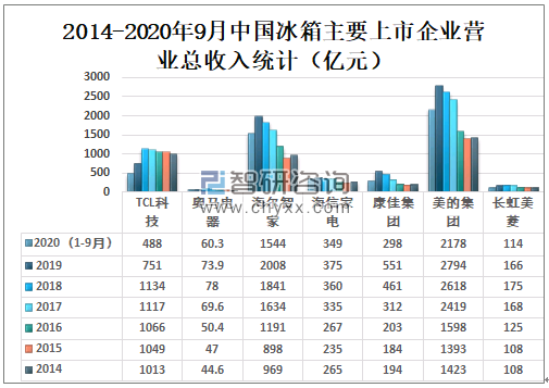 2014-2020年9月中国冰箱主要上市企业营业总收入统计(亿元)