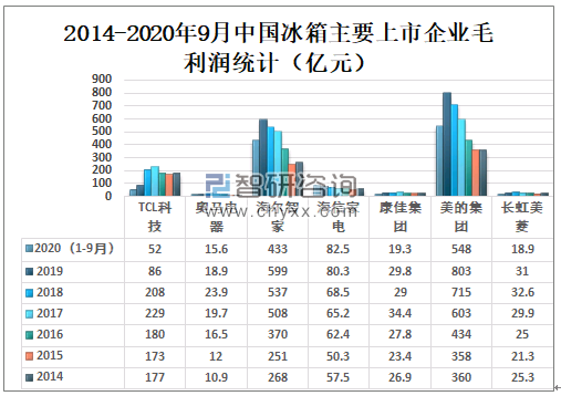 2014-2020年9月中国冰箱主要上市企业毛利润统计(亿元)