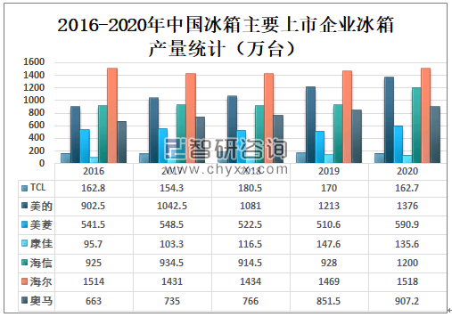 2020年TCL冰箱产量为162.7万台,较2019年减少了7.3万台;美的冰箱产量为1376万台,较2019年增加了163万台;美菱冰箱产量为590.9万台,较2019年增加了80.3万台;康佳冰箱产量为135.6万台,较2019年减少了12万台;海信冰箱产量为1200万台,较2019年增加了272万台;海尔冰箱产量为1518万台,较2019年增加了49万台;奥马冰箱产量为907.2万台,较2019年增加了55.7万台。