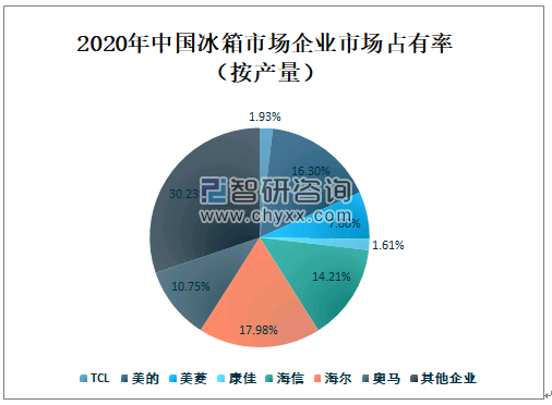 2020年TCL冰箱产量占全国冰箱总产量的1.93%;美的冰箱产量占全国冰箱总产量的16.30%;美菱冰箱产量占全国冰箱总产量的7.00%;康佳冰箱产量占全国冰箱总产量的1.61%;海信冰箱产量占全国冰箱总产量的14.21%;海尔冰箱产量占全国冰箱总产量的17.98%;奥马冰箱产量占全国冰箱总产量的10.75%。2020年TCL、美的、美菱、康佳、海信、海尔、奥马七家上市企业冰箱产量总和占全国冰箱总产量的69.77%,,企业市场占有率较高,市场集中度较高。