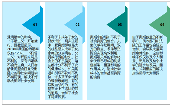 虽然离婚是个人行为,在某种程度上是对不美满婚姻的一种解脱,但是离婚率持续上升,对中国社会稳定,尤其是建立和谐社会的目标构成了一定的威胁。离婚率带来的负面影响相对较多,其中对婚姻家庭的影响是比较直观的,对社会来说是间接的、隐性的。