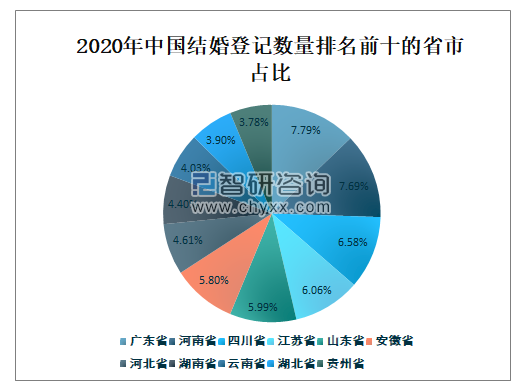2020年广东省、河南省、四川省、江苏省、山东省、安徽省、河北省、湖南省、云南省、湖北省和贵州省十个省份结婚登记数量总和占全国结婚登记总数量的60.63%。其中广东省结婚登记数量占全国结婚登记总数量的7.79%,占比最大;河南省结婚登记数量占全国结婚登记总数量的7.69%;四川省结婚登记数量占全国结婚登记总数量的6.58%;江苏省结婚登记数量占全国结婚登记总数量的6.06%;山东省结婚登记数量占全国结婚登记总数量的5.99%;安徽省结婚登记数量占全国结婚登记总数量的5.80%;河北省结婚登记数量占全国结婚登记总数量的4.61%;湖南省结婚登记数量占全国结婚登记总数量的4.40%;云南省结婚登记数量占全国结婚登记总数量的4.03%;湖北省结婚登记数量占全国结婚登记总数量的3.90%;贵州省结婚登记数量占全国结婚登记总数量的3.78%。