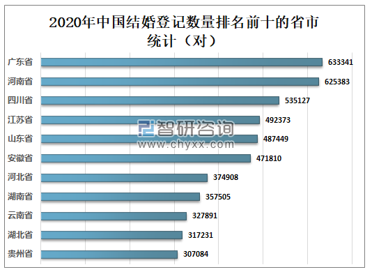 2020年广东省共办理结婚登记633341对,全国排名第一;河南省共办理结婚登记625383对,全国排名第二;四川省共办理结婚登记535127对,全国排名第三。