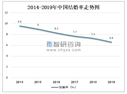 中国结婚率逐年下降,2019年中国结婚率为6.6‰,较2018年减少了0.7‰。