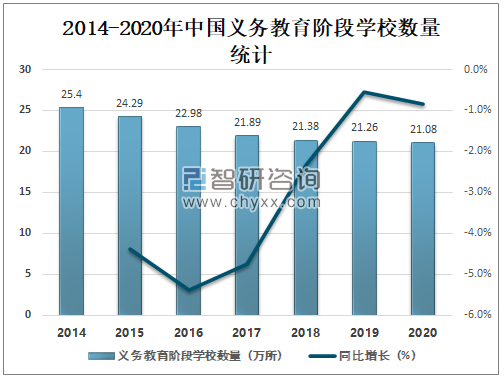 近年来中国义务教育阶段学校数量逐年减少,2020年中国义务教育阶段学校数量为21.08万所,较2019年减少了0.18万所,同比减少0.8%。