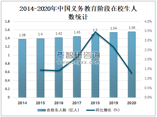 中国义务教育阶段在校生人数逐年攀升,2020年中国义务教育阶段在校生人数达1.56亿人,较2019年增加了0.02亿人,同比增长1.3%。