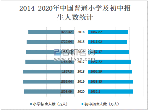 2020年中国普通小学招生人数为1808.09万人,较2019年减少了60.95万人;初中招生人数为1632.1万人,较2019年减少了6.75万人。