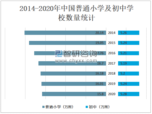 智研咨询发布的《2021-2027年中国教育行业市场竞争现状及发展趋势分析报告》数据显示:2020年中国共有普通小学15.8万所,较2019年减少了0.21万所;共有初中5.28万所,较2019年增加了0.04万所。