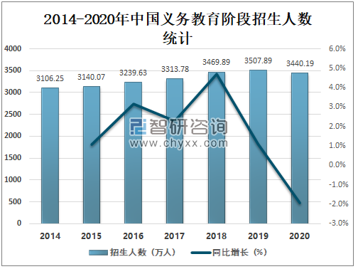 中国义务教育阶段招生人数快速增长,2019年中国义务教育阶段招生人数达3507.89万人,较2018年增加了38万人,同比增长1.1%,2020年首次出现下滑,2020年中国义务教育阶段招生人数为3440.19万人,较2019年减少了67.7万人,同比减少1.9%。
