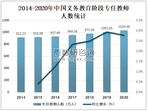随着中国义务教育均衡发展,师资队伍方面取得突出成就,2020年中国义务教育阶段专任教师人数达1029.49万人,较2019年增加了27.84万人,同比增长2.8%。