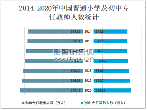 2020年中国普通小学专任教师人数为643.42万人,较2019年增加了16.51万人;初中专任教师人数为386.07万人,较2019年增加了11.33万人。