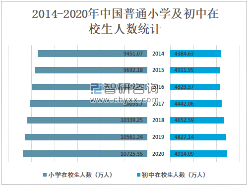 2020年中国普通小学在校生人数达10725.35万人,较2019年增加了164.11万人;初中在校生人数达4914.09万人,较2019年增加了86.95万人。