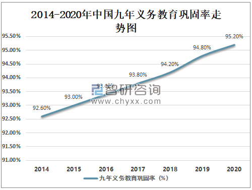 中国九年义务教育巩固率逐年攀升,2020年中国九年义务教育巩固率达95.20%,较2019年增长了0.40%。