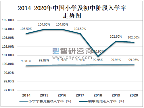 2020年中国小学学龄儿童净入学率为99.96%,较2019年增长了0.02%;初中阶段毛入学率为102.50%,较2019年减少了0.10%。