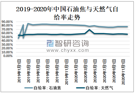 2019-2020年中国石油焦与天然气自给率走势
