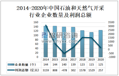 2014-2020年中国石油和天然气开采行业企业数量及利润总额
