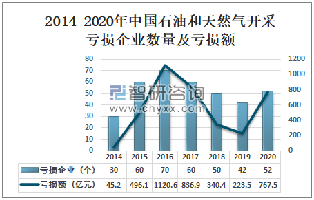 石油和天然气开采行业受国内外宏观经济、供需环境、基数效应、国际油价、价格走势、结构调整等多种因素。2020年中国石油和天然气开采行业亏损企业数量为52个,比2019年增加10个;中国石油和天然气开采行业亏损额为767.5亿元,同比增长243.4%。
