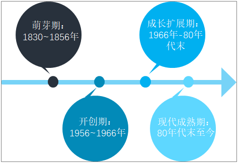 世界集装箱的发展经历了世界集装箱发展的萌芽期(1830~1856年),世界集装箱的开创期(1956~1966),世界集装箱的成长扩展期(1966年-80年代末)和世界集装箱的现代成熟期(80年代末至今)等四个时期的发展才逐渐形成如今的产业化规模。