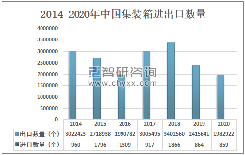 受全球经济增速放缓影响,全球集运行业需求增速也有所放缓,导致2018年以来,中国集装箱出口数量不断下降,2020年中国集装箱出口数量为1982922个,进口数量仅为859个。