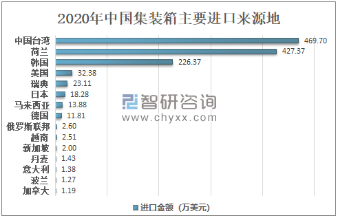 2020年中国从中国台湾进口集装箱469.70万美元,占总进口金额的19.5%;从荷兰进口427.37万美元,占总进口金额的17.7%;从韩国进口226.37万美元,占总进口金额的9.4%。